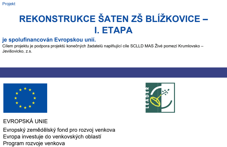 Projekt rekonstrukce šaten na základní škole v Blížkovicích vstoupil do své první etapy a je spolufinancován Evropskou unií. Tento projekt je zaměřen na podporu rozvoje venkovských oblastí a naplňuje cíle SCLLD MAS Živé pomezí Krumlovsko – Jevišovicko. Financování je zajištěno prostřednictvím Evropského zemědělského fondu pro rozvoj venkova, který je součástí Programu rozvoje venkova, přičemž Evropská unie investuje do zlepšování infrastruktury ve venkovských oblastech.